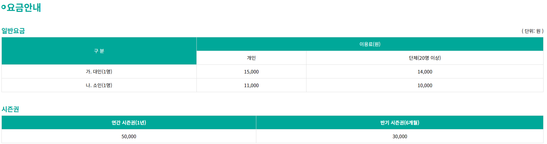 단체 왕복 요금은 대인 14,000원, 소인 10,000원입니다. 또한, 장기 이용을 원하는 방문객을 위해 시즌권도 제공되며, 연간 시즌권은 50,000원, 반기 시즌권은 30,000원으로 구입할 수 있습니다.