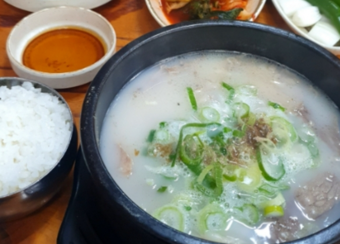 곰탕에 넉넉하게 들어간 대파와 볶은 소금으로 간을 맞추면 든든하고 따뜻한 한 끼 식사를 할 수 있습니다.