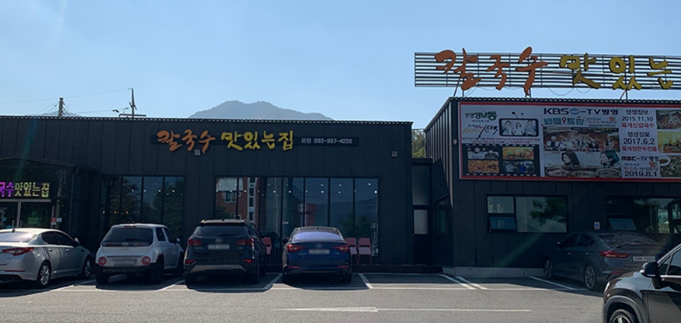 칼국수맛있는집은 마니산 초입 문산리 마을회관 인근에 위치하여 찾아가기 쉽습니다. 매장 앞과 뒤에 자체 주차장이 넓어 대형차 주차도 가능합니다.