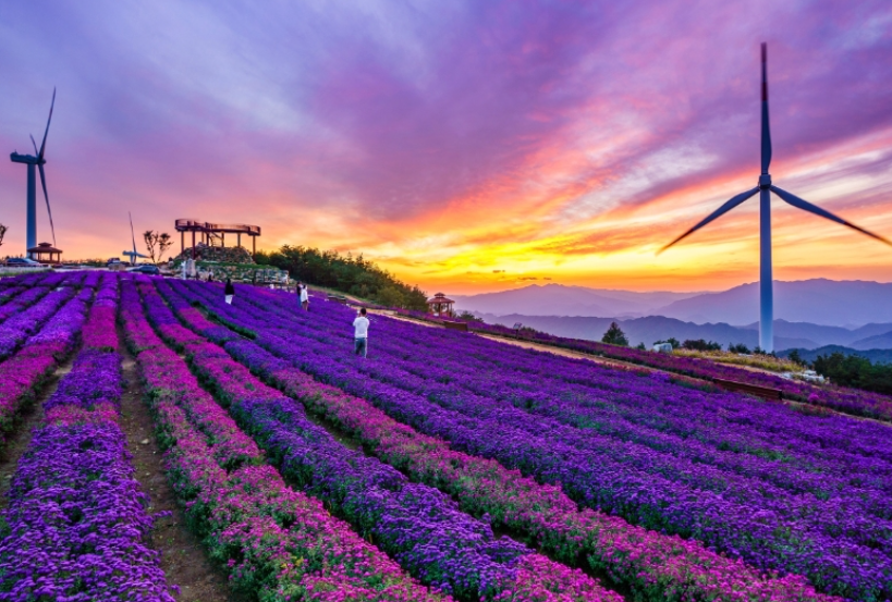가을이면 정상 부근에 펼쳐지는 보랏빛 아스타 국화 꽃밭이 유명합니다. 산 정상에는 풍력 발전기가 설치되어 있어 이국적인 풍경을 자아냅니다. 탁 트인 전망 덕분에 일출과 일몰을 감상하기 좋은 곳으로 알려져 있습니다.