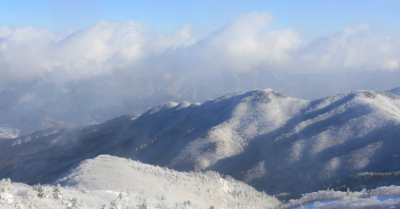 덕유산 정상인 향적봉에서는 탁 트인 전망을 감상할 수 있으며, 운이 좋으면 눈꽃으로 뒤덮인 나무들이 만들어내는 아름다운 상고대를 볼 수도 있습니다.