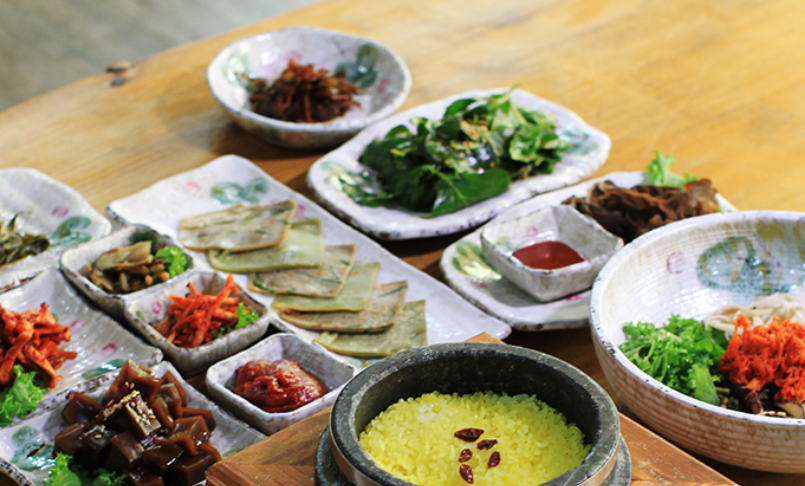 점봉산에서 직접 채취한 싱싱한 산나물은 향긋한 봄 내음을 가득 담고 있습니다. 된장국과 함께 도토리묵, 각종 버섯, 산나물, 열무, 도라지, 무채 나물 등 푸짐한 반찬이 함께 제공됩니다. 특히 치자로 물들인 노란색 밥은 보기에도 좋고 건강에도 좋습니다.