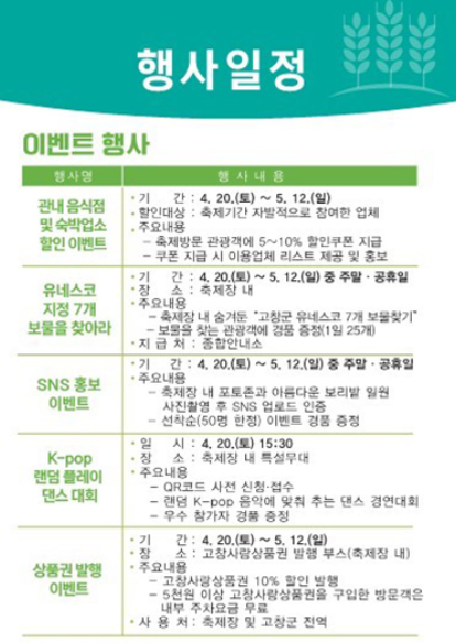 축제 기간 동안에는 청보리와 유채꽃이 피어난 청보리밭을 감상할 수 있으며, 전문 공연팀과 고창 군민이 연주하는 다양한 음악을 즐길 수 있습니다.