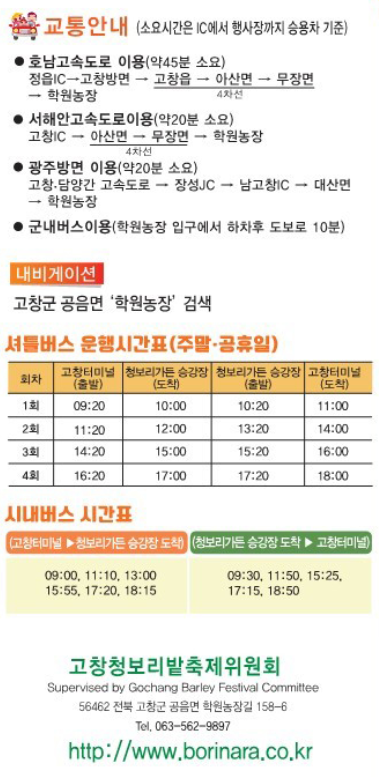 자세한 내용은 고창청보리밭축제위원회 또는 고창군으로 문의해 보실수 있습니다. 전화번호는 063-560-2524입니다.