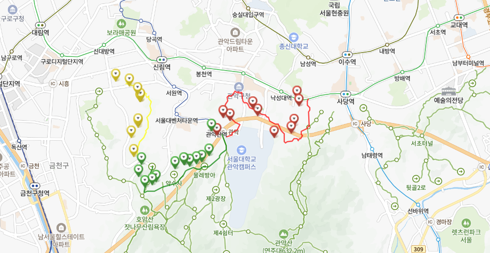 사당역 코스: 사당역에서 시작하여 관악 주능선을 따라 오르는 코스입니다. 가장 긴 코스이며, 초반에는 가파른 경사가 이어지지만 이후에는 오르막과 내리막이 번갈아 나타납니다. 서울의 탁 트인 전망을 감상할 수 있다는 장점이 있습니다.