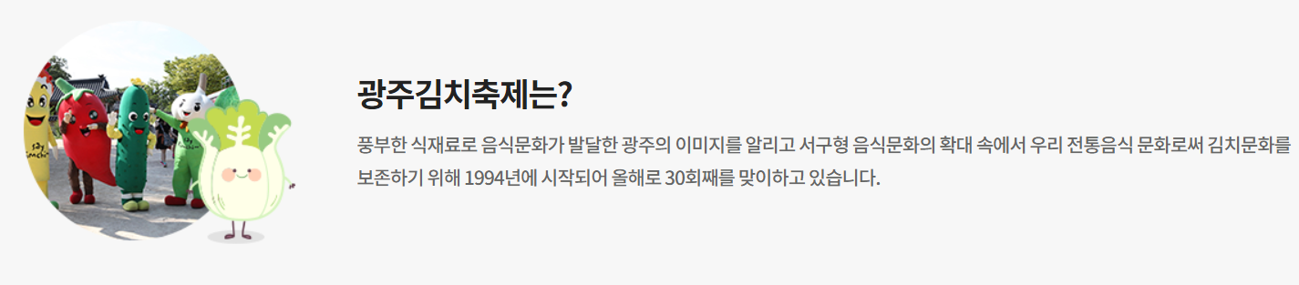 대한민국을 대표하는 음식중의 음식이 바로 김치입니다. 광주광역시에서는 이 김치를 바탕으로 하는 축제가 있습니다. 바로 광주 김치축제입니다.