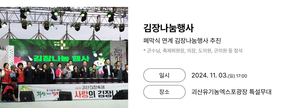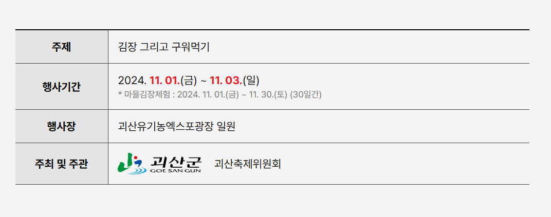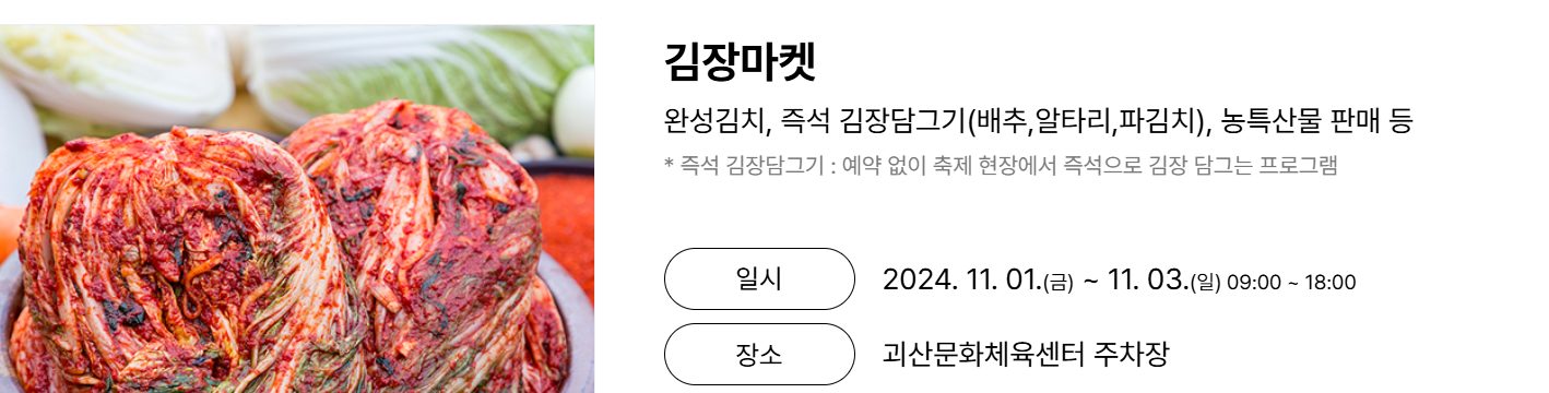 2024 괴산김장축제가 곧 시작됩니다. 이 축제는 11월 1일부터 3일까지 충청북도 괴산군에서 열리며, 매년 많은 방문객들이 찾는 인기 있는 행사입니다.