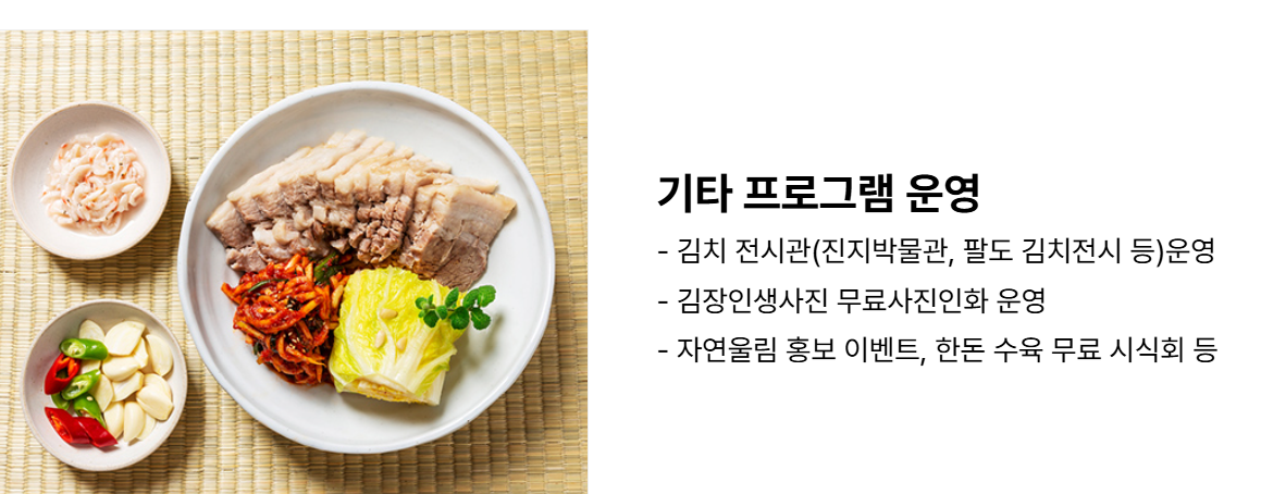 또한, 김장 명인과 함께하는 김장 토크 및 팔도 김치 전시도 진행되어 다양한 지역의 김치 맛과 문화에 대한 이야기를 들을 수 있는 소중한 시간이 마련됩니다.