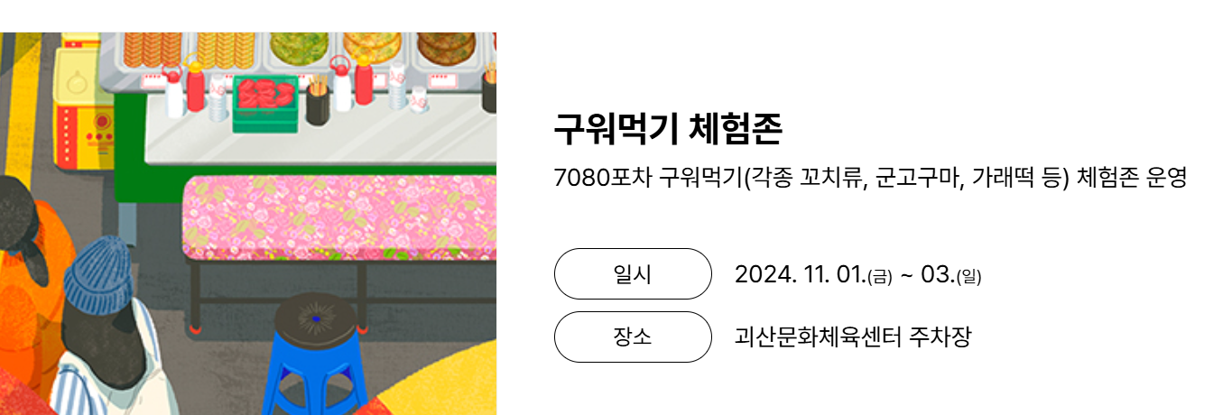 특히 이번 축제에서는 구워먹기 체험존이 마련되어 있어, 7080포차에서 다양한 먹거리를 맛볼 수 있습니다. 꼬치류, 군고구마, 가래떡 등 어린 시절의 추억을 떠올리게 하는 다양한 먹거리가 준비되어 있어 방문객들에게 즐거운 미식 경험을 선사할 것입니다.