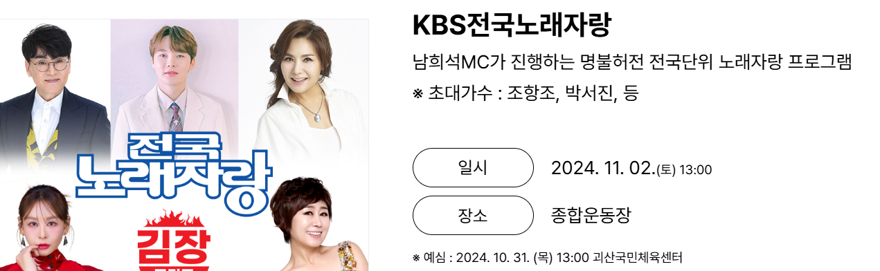 KBS 전국노래자랑 프로그램도 남희석 MC와 함께 진행되어 참가자들과 관객들이 함께 즐길 수 있는 화합의 장이 될 것입니다. 다양한 프로그램이 함께 어우러져 축제 분위기를 더욱 활기차게 만들어 줄 것입니다. 초대가수로 트로트 가수들이 참여하며 조항조, 박서진, 진욱등이 참여한다고 하니 기대가 됩니다.