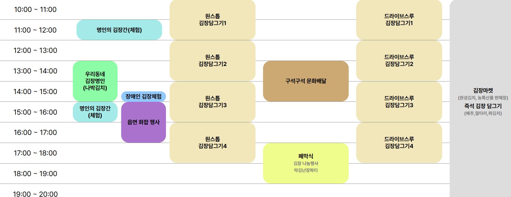 방문객들은 원스톱 김장 담그기 체험을 통해 쉽게 김장을 경험할 수 있으며, 드라이브 스루 김장 담그기 프로그램도 마련되어 있어 차량에 바로 김치를 실어 갈 수 있습니다. 이처럼 다양한 방식으로 김장을 체험할 수 있는 기회가 주어진다는 점에서 많은 사람들의 관심을 끌고 있습니다.