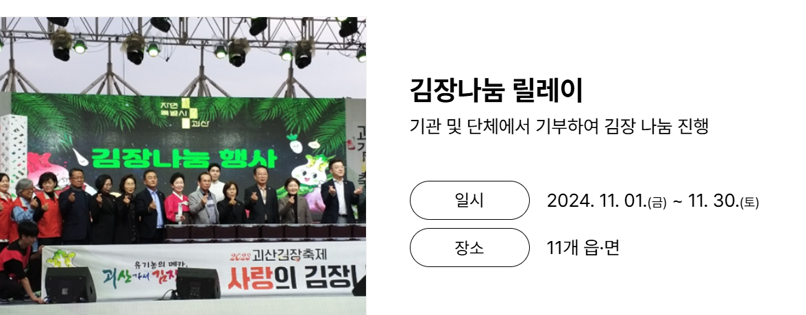 2024 괴산 김장축제가 여러분을 기다립니다! 벌써부터 많은 분들의 관심을 받고 있는 괴산 김장축제의 사전 예약이 완판되었다고 하는데요, 어떤 프로그램들이 준비되어 있는지 자세히 알아볼까요?