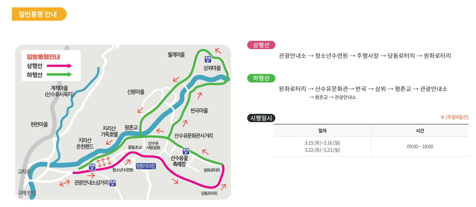 작년 축제를 고려한다면 산수유축제장 근처의 도로를 일방통행으로 관리하여 길의 한편에 차량을 주차하도록 할 것으로 예상됩니다.