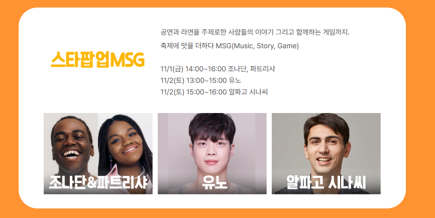 메인 프로그램으로는 이색 라면 식음존, 스트릿 댄스 파이터, 라면 요리 경연 대회가 진행됩니다. 이 대회에서는 참가자들이 창의적인 라면 요리를 선보이며, 맛과 개성을 겨루는 재미있는 시간이 될 것입니다.