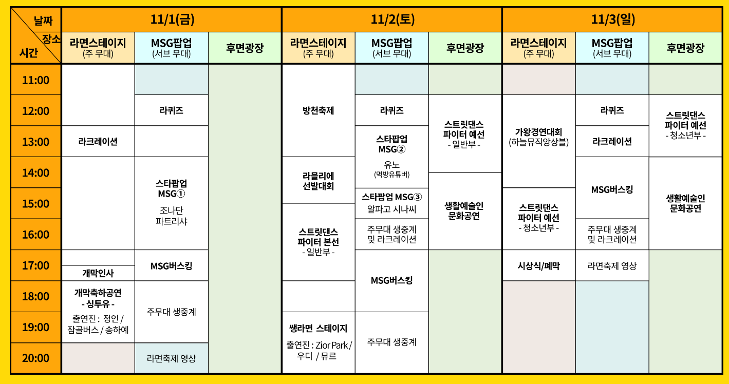 행사에는 라면 테마 전시, 체험, 포토존, 무대 프로그램, 각종 이벤트 등이 마련되어 있어 가족 단위의 방문객들도 즐길 수 있는 다양한 활동이 준비되어 있습니다.