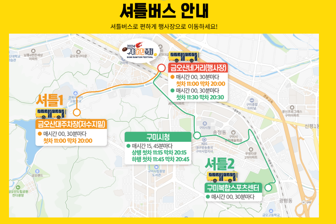 셔틀버스는 금오산 대주차장, 구미시복합스포츠센터, 구미시청에서 축제장까지 운행됩니다. 축제 기간 동안 매일 오전 11시부터 오후 8시까지 20분 간격으로 운행되며 무료로 이용할 수 있습니다.