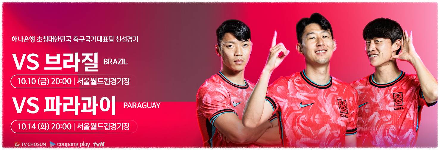 다음으로 대한민국 축구 국가대표팀은 2025년 10월 14일 화요일 오후 8시에 서울월드컵경기장에서 파라과이와 친선 경기를 치를 예정입니다. 이번 경기는 하나은행 초청 평가전의 일환으로 진행되며, TV 조선과 쿠팡플레이, tvN에서 중계될 예정입니다. 파라과이 축구협회는 10월 A매치 기간 동안 26명의 선수를 소집했으며, 미겔 알미론을 비롯한 핵심 선수들이 명단에 포함되어 있습니다.