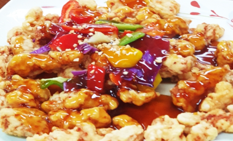 넓고 깔끔한 식당 내부에는 테이블이 여유롭게 배치되어 있어 편안하게 식사를 즐길 수 있습니다. 바삭하게 튀겨낸 탕수육은 파프리카와 양파가 가득 올려져 있어 아삭한 맛을 더했습니다.