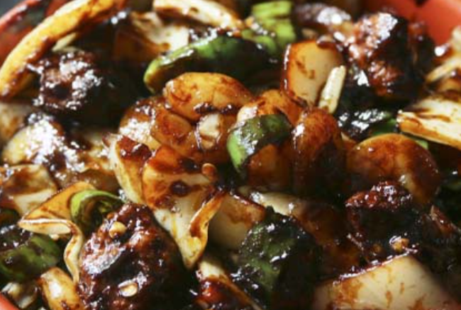지린성의 대표 메뉴는 바로 고추 짜장입니다. 큼직한 해산물과 고기가 푸짐하게 들어가 있으며, 고추로 우려낸 깔끔하고 매콤한 맛이 일품입니다.