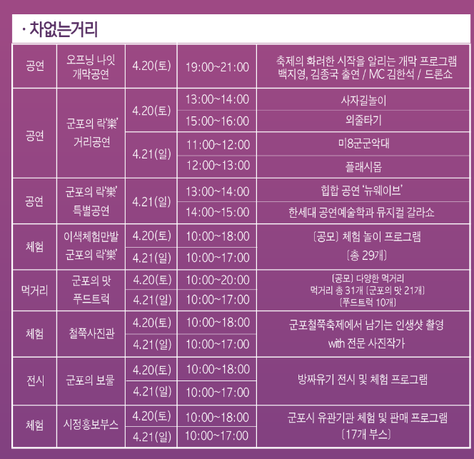 철쭉축제는 차 없는 거리에서 활력 넘치는 개막식으로 막을 열고, 감동적인 폐막식으로 행사를 마감합니다. 이번 축제에서는 군포의 다채로운 맛과 멋, 그리고 락을 즐길 수 있는 다양한 프로그램이 마련되어 있습니다.