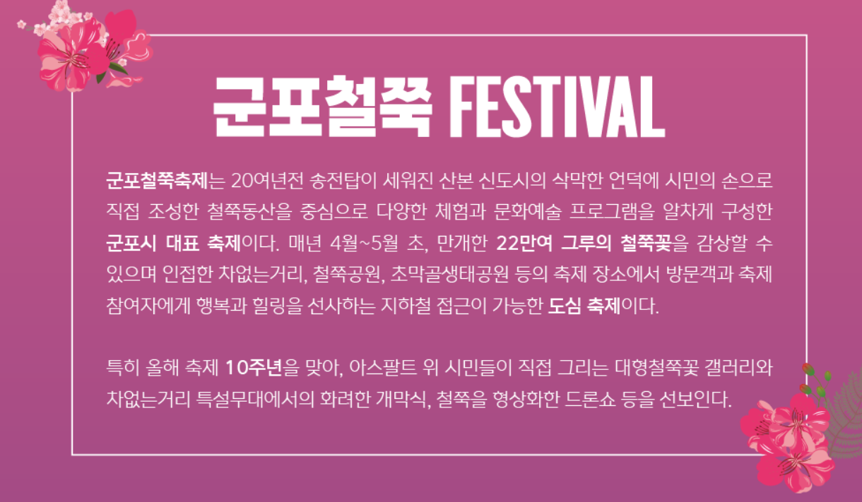 봄이 찾아왔습니다. 군포에서는 매년 봄철에 열리는 철쭉축제가 예정되어 있습니다. 이번 축제는 지역의 아름다움과 다채로운 매력을 함께 누릴 수 있는 특별한 시간으로 기대됩니다.