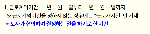 예를 들어서 2023년 12 월 1 일부터 2024 년 12 월 1 일까지 등으로 기간이 명시 되어야 합니다. 만약 기간이 정해지지 않았다고 한다면 근로개시일만 작성하시면 됩니다.