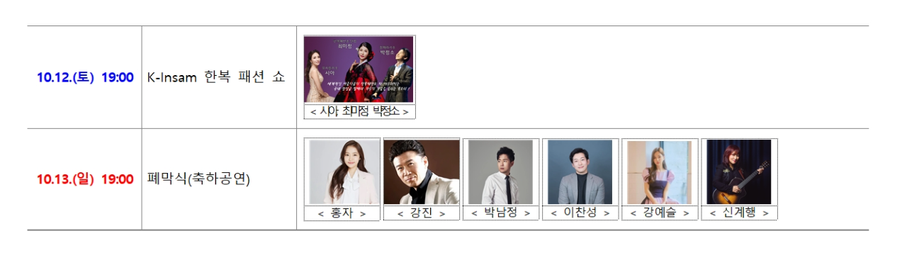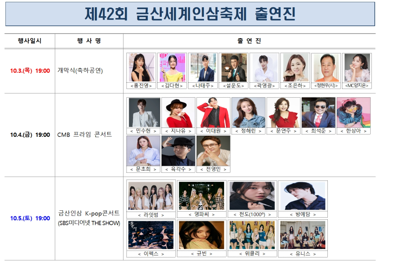 10월4일 금요일에는 민수현, 지나유등 트로트 가수들이 흥을 불러일으킵니다. 토요일에는 케이팝 가수들이 대거 출연하여 축제의 장을 만들예정이며 이외에도 많은 연예인들이 참여할 예정이니 금산 인삼축제를 방문할 재미가 더할 전망입니다.