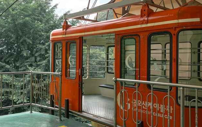 특히 널찍한 내부와 개방된 창문은 탁 트인 전망을 감상하기에 완벽하며, 붉은색 외관은 푸른 산자락과 대비되어 이국적인 분위기를 자아냅니다. 케이블카를 이용하면 쉽게 해운사까지 이동하여 금오산 정상까지의 등산을 시작할 수 있습니다.