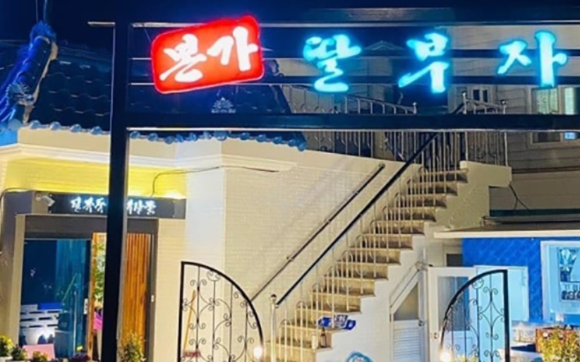 부산 기장 연화리에 위치한 본가딸부자전복죽집은 가정식 주택을 개조하여 운영하는 곳으로, 파란 기와와 흰색 벽돌로 된 외관이 눈에 띕니다.
