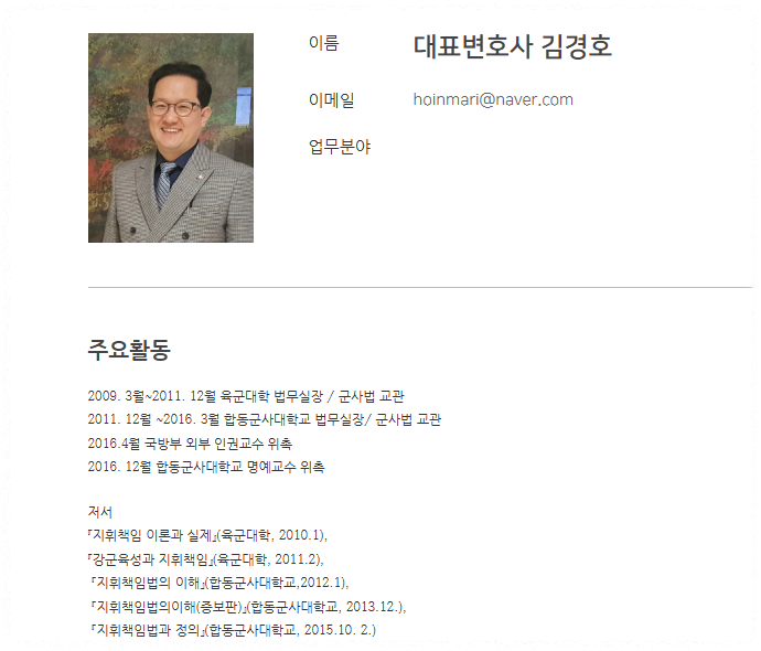 법률사무소 호인은 주로 군사법 전문 변호사들로 구성되어 있으며, 김경호 변호사도 이곳에서 대표변호사로 활동하며 군인과 군 관계자들의 법적 문제를 전문적으로 해결하고 있습니다. 대전 유성구 신성로에 위치해 있으며, 온라인 상담까지 제공해 접근성도 좋은 편입니다.