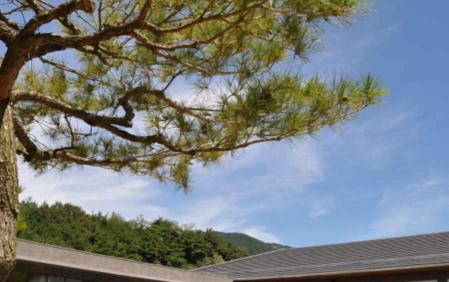 지리산 자락에 위치한 미술관 건물은 곡선과 직선이 조화롭게 어우러진 독특한 형태로, 주변 자연과 아름답게 어우러져 있습니다.