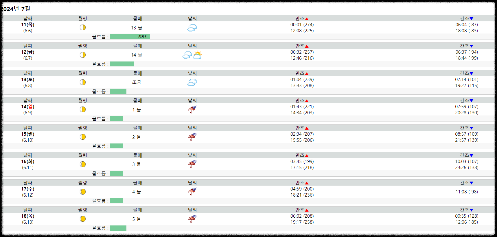 만조 및 간조: 바닷물이 가장 높이 차오르는 시간(만조)과 가장 낮아지는 시간(간조)이 기록됩니다.