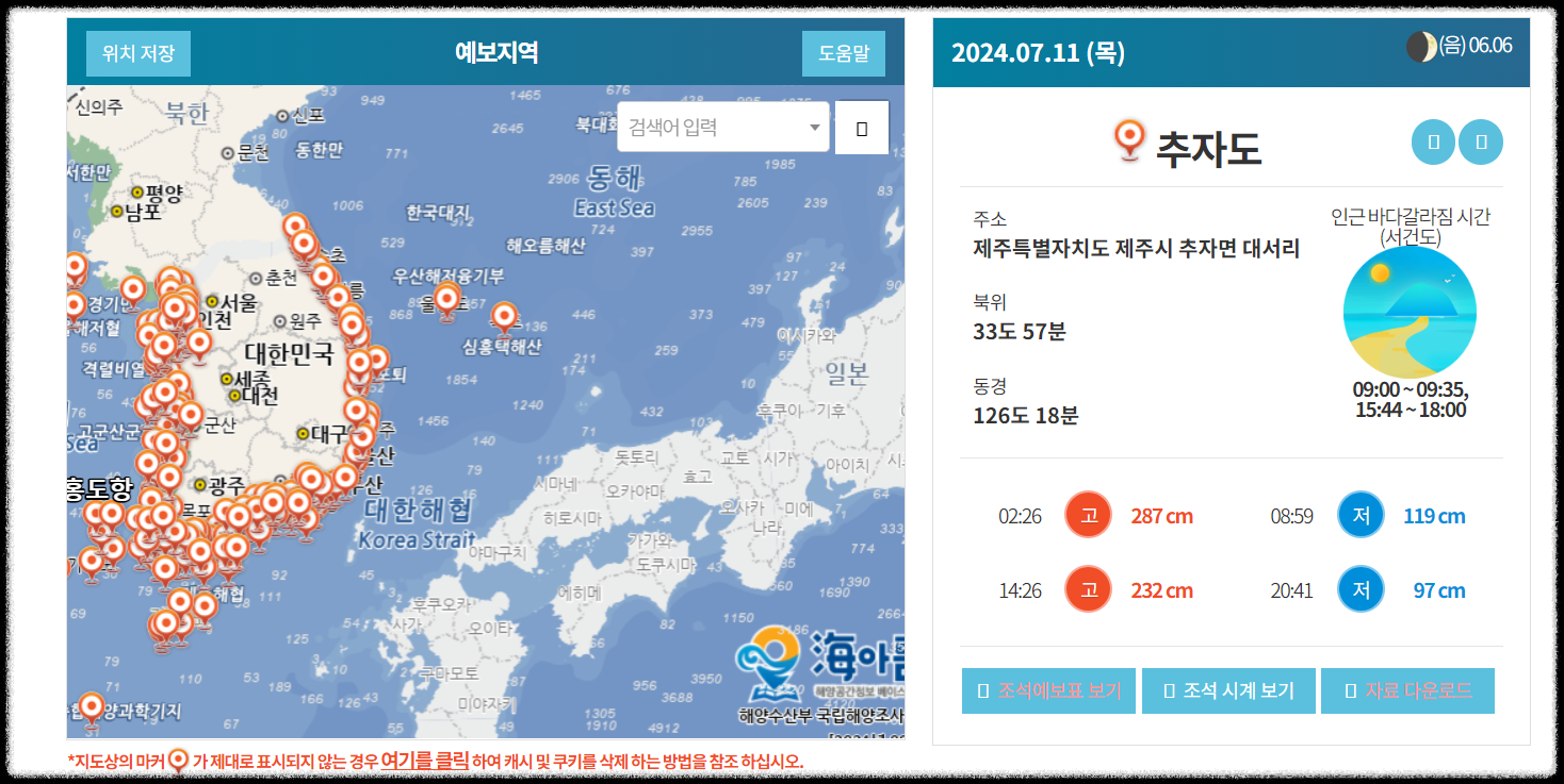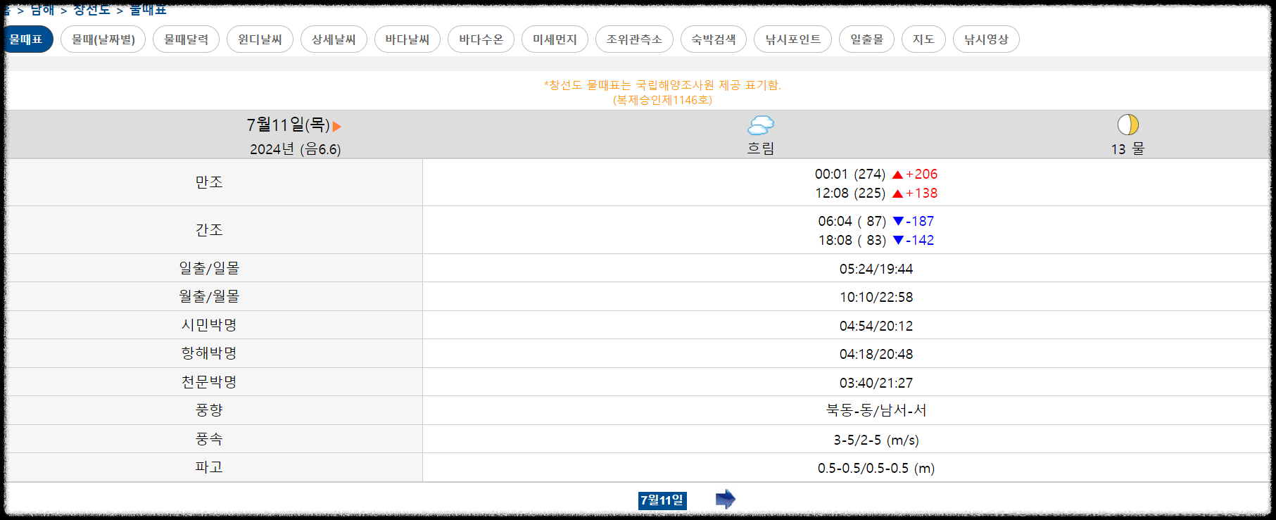 이 사이트에서는 남해뿐만 아니라 전국의 물때표를 확인할 수 있습니다. 사용 방법은 간단합니다.