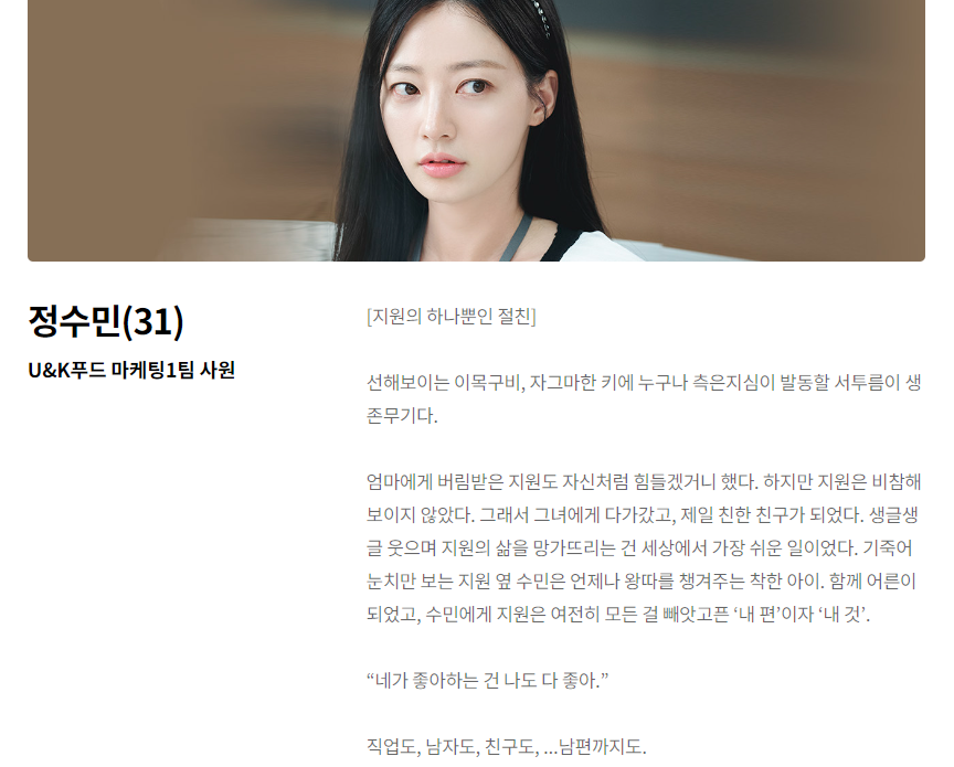 33세의 박민환 역은 배우 이이경님이 맡았습니다. U&K푸드 마케팅 1팀 대리이자 지원의 전 남편이자 현재의 남자친구입니다. 31세의 정수민 역은 배우 송하윤님이 맡았습니다.