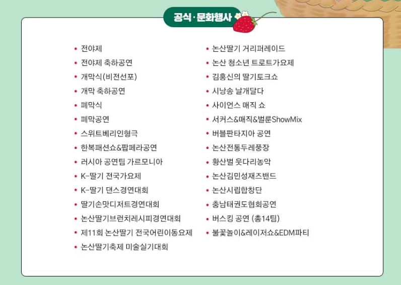논산딸기 코스프레, 딸기 거리퍼레이드, 논산딸기디저트카페, 불꽃놀이, 푸드트럭, 인기가수 공연 등 다채로운 행사가 진행될 예정입니다.