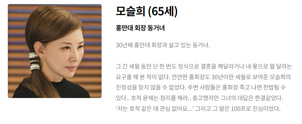 모슬희 역은 배우 이미숙이 맡았으며 만대의 동거녀입니다. 퀸즈 일가에 대해 욕심이 없으며 마치 수녀와 같은 마음으로 인생을 살아가는 인물입니다.