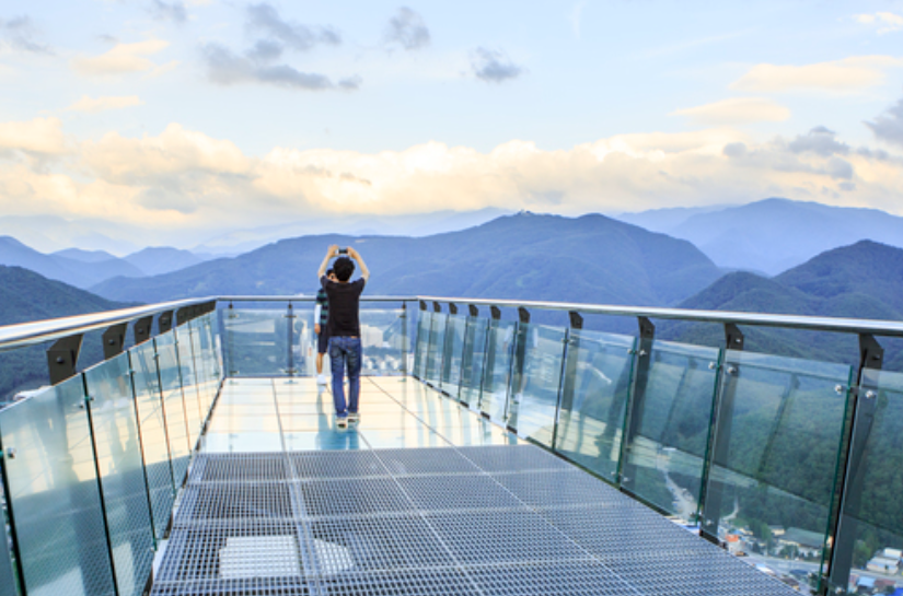 스카이워크를 걷는 동안에는 아래로 내려다보면 단양의 명산인 소백산과 노고단, 그리고 멋진 강이 한눈에 들어옵니다. 특히 유리 바닥으로 만들어진 부분은 높이감을 더욱 강조하여 스릴있는 경험을 선사합니다.