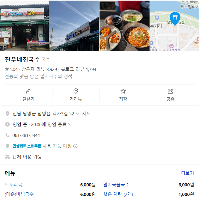 곁들여 나오는 삶은 달걀과 돼지고기 육전은 단순한 사이드가 아니라, 국수와 함께 즐기면 든든한 한 끼가 됩니다. 옛날식 간판과 낡은 나무 테이블이 오히려 정겹게 느껴지며, 세월의 흔적 속에서 담양의 따뜻한 인심을 느낄 수 있습니다. 주소는 전라남도 담양군 담양읍 객사리 211-34입니다.