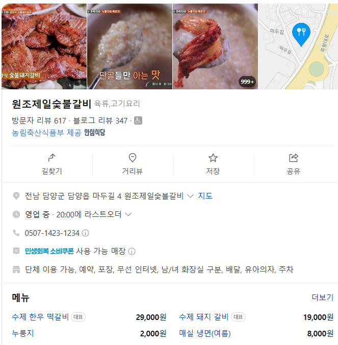3. 원조제일숯불갈비 – 전통의 손맛이 살아 있는 떡갈비 담양 여행에서 떡갈비를 빼놓을 수는 없습니다. 그 중심에는 ‘원조제일숯불갈비’가 있습니다. 이곳은 담양식 떡갈비의 원형을 고수하며, 한우 갈비살을 곱게 다져 다시 갈비뼈 위에 올려 구워내는 독특한 방식을 유지하고 있습니다.