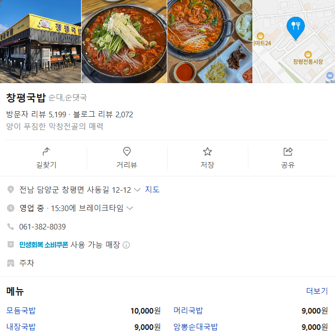 창평시장에서 오랜 시간 사랑받아온 창평국밥은 한 그릇에 담양의 인심이 그대로 녹아 있는 곳입니다. 막창전골은 푸짐한 양과 진한 국물이 어우러져, 국물 한 숟가락에 고소함과 매콤함이 동시에 느껴집니다. 모듬국밥에는 머리고기, 순대, 내장 등 다양한 재료가 들어가 풍성한 식감이 일품입니다.