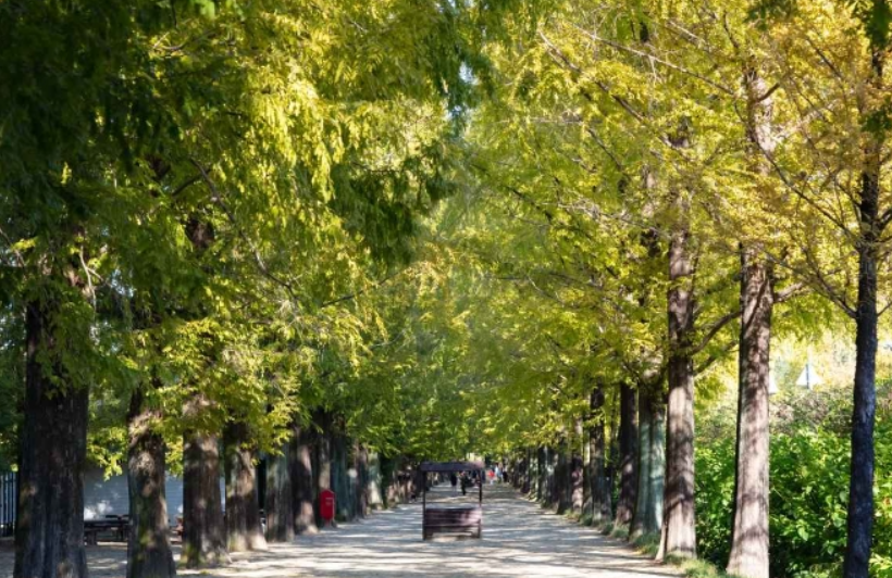 2.1km에 이르는 길 양쪽으로 높이 솟은 메타세콰이어 나무들이 빽빽하게 늘어서 있어, 마치 푸른 터널 속을 걷는 듯한 신비로운 느낌을 선사합니다. 햇빛이 나뭇잎 사이로 스며들어 만들어내는 빛과 그림자의 조화는 말로 표현할 수 없을 만큼 아름답습니다.