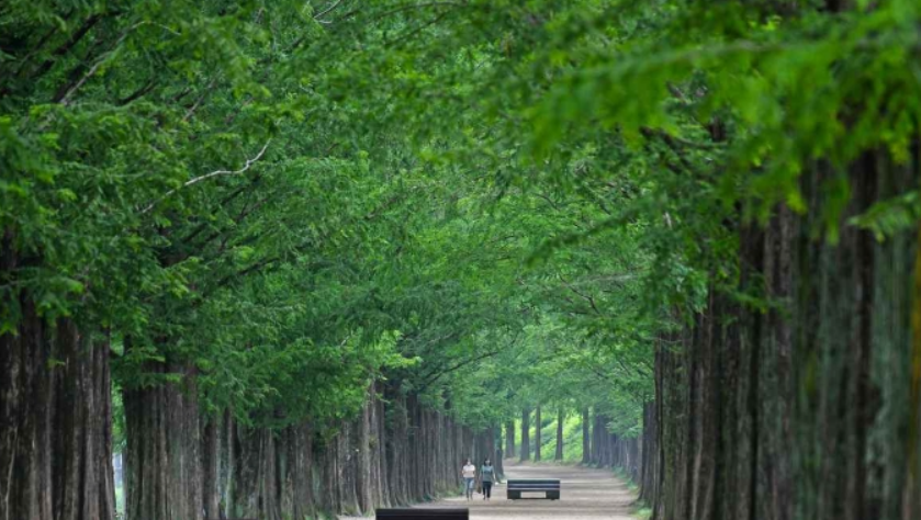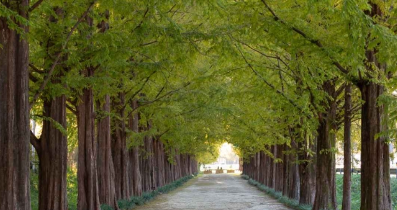 2.1km에 이르는 길 양쪽으로 높이 솟은 메타세콰이어 나무들이 빽빽하게 늘어서 있어, 마치 푸른 터널 속을 걷는 듯한 신비로운 느낌을 선사합니다. 햇빛이 나뭇잎 사이로 스며들어 만들어내는 빛과 그림자의 조화는 말로 표현할 수 없을 만큼 아름답습니다.