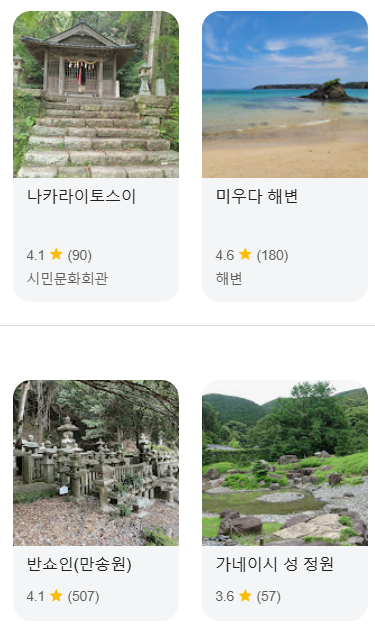 점심 식사는 현지 해산물을 맛볼 수 있는 식당을 추천하며, 오후에는 미우다 해변에서 잠시 휴식을 취하거나, 슈젠지 온천에서 여독을 푸는 것도 좋은 선택입니다.