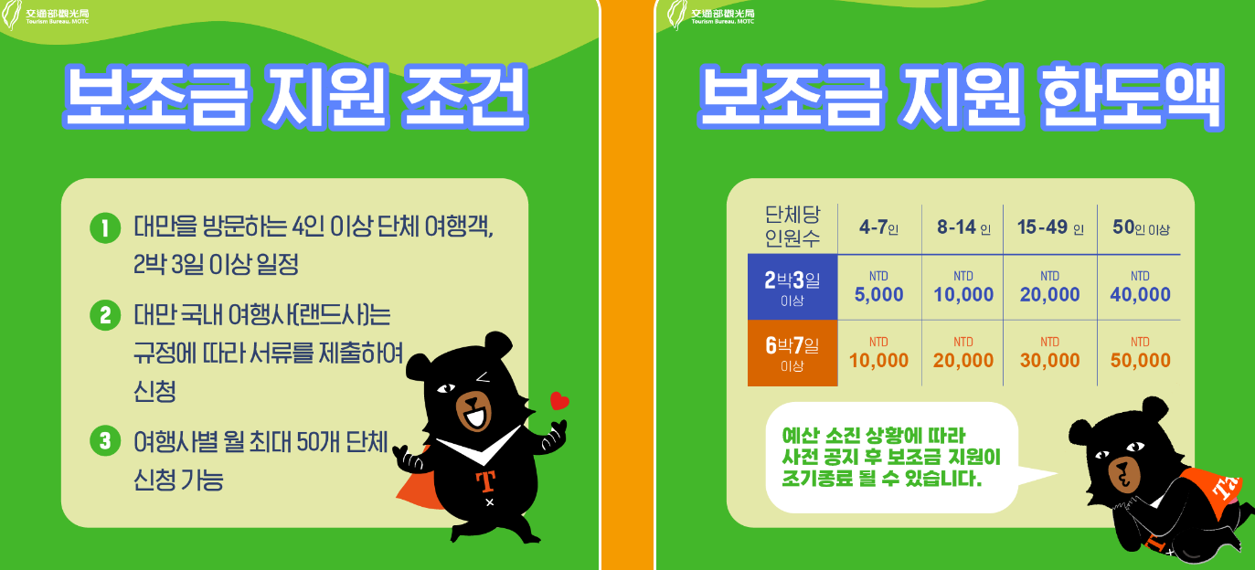 여행사 단체 투어 그룹은 최소 4명의 멤버가 있어야 하며, 최소 2박 3일 동안 대만에 체류해야 합니다. 지원금은 투어 그룹 구성원 수와 체류 기간에 따라 투어 단체 당 NT$5,000~NT$50,000의 비용이 지급됩니다.