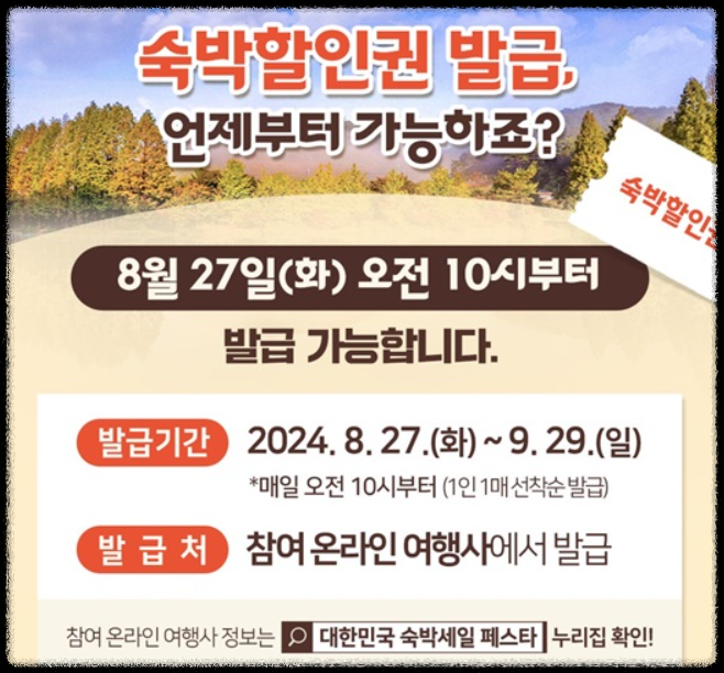 쿠폰 발급은 8월 27일부터 9월 29일까지, 매일 오전 10시에 선착순으로 진행되니 서두르는 것이 좋습니다. 숙박은 9월 9일부터 10월 13일까지, 서울, 경기, 인천을 제외한 전국 어디든 가능합니다.