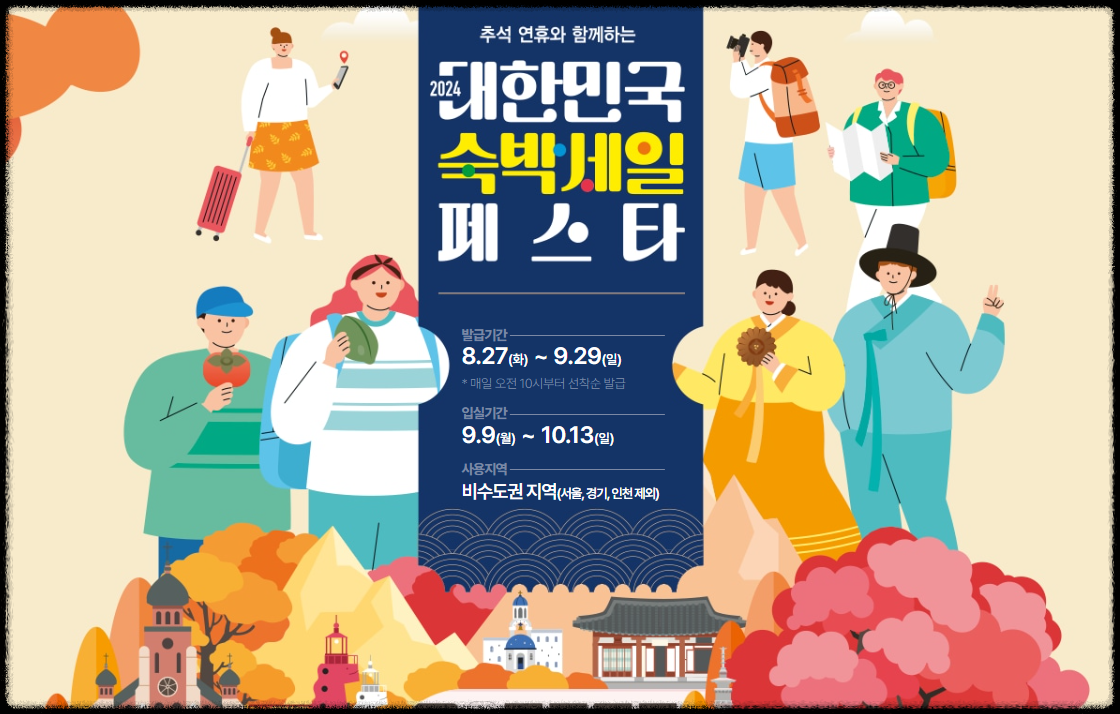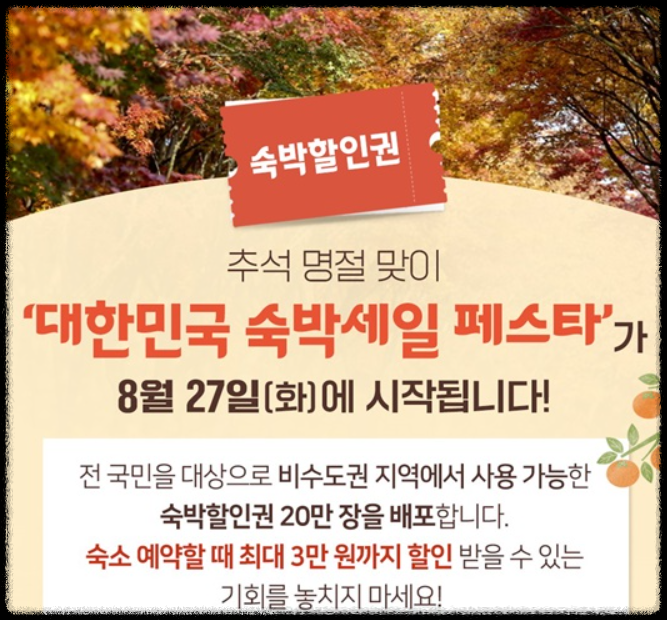 쿠폰 발급은 8월 27일부터 9월 29일까지, 매일 오전 10시에 선착순으로 진행되니 서두르는 것이 좋습니다. 숙박은 9월 9일부터 10월 13일까지, 서울, 경기, 인천을 제외한 전국 어디든 가능합니다.