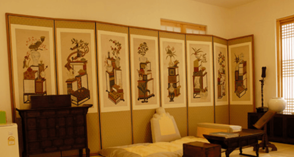 별채에 위치한 월파실과 함허실은 김해 한옥체험관에서 가장 고풍스러운 객실로, 커다란 병풍과 전통 보료가 마치 사극 속 한 장면에 들어온 듯한 느낌을 줍니다.