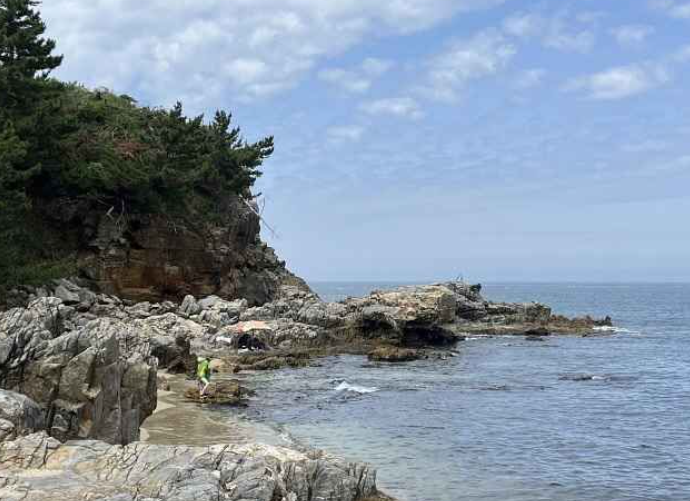 맑고 깨끗한 바닷물과 고운 모래사장이 특징이며, 주변의 소나무 숲과 절벽이 어우러져 독특한 경관을 자랑합니다. 해변은 길지 않지만 아담하고 아늑한 분위기가 매력적이며, 인근에 작은 바위섬이 있어 탐험하듯 걸어볼 수 있습니다.