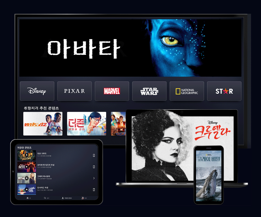 미국의 유명기업인 월트 디즈니사에서 설립한 OTT 서비스입니다. 특히 유명한 마블 시리즈와 스타워즈등의 대표적인 콘텐츠가 있습니다.