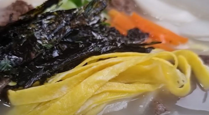 김을 구워 잘게 부수거나 채 썰어 올려줍니다. 김은 떡국에 감칠맛과 향긋함을 더해줍니다. 김을 구울 때는 약한 불에 살짝 구워야 타지 않고 고소한 맛을 낼 수 있습니다. 쇠고기를 얇게 썰어 양념하여 볶아서 올려줍니다. 불고기 양념을 사용해도 좋습니다.